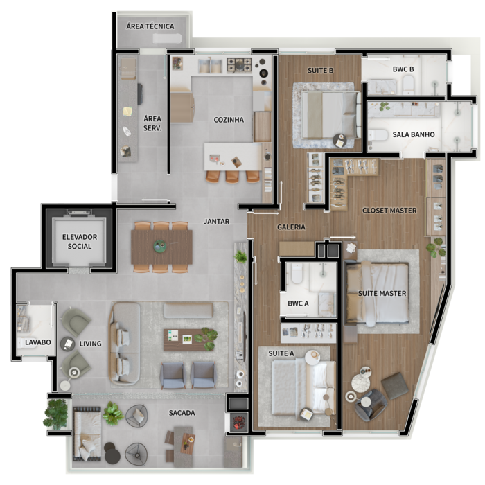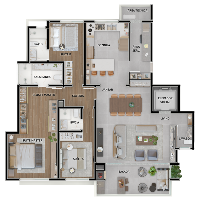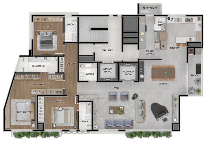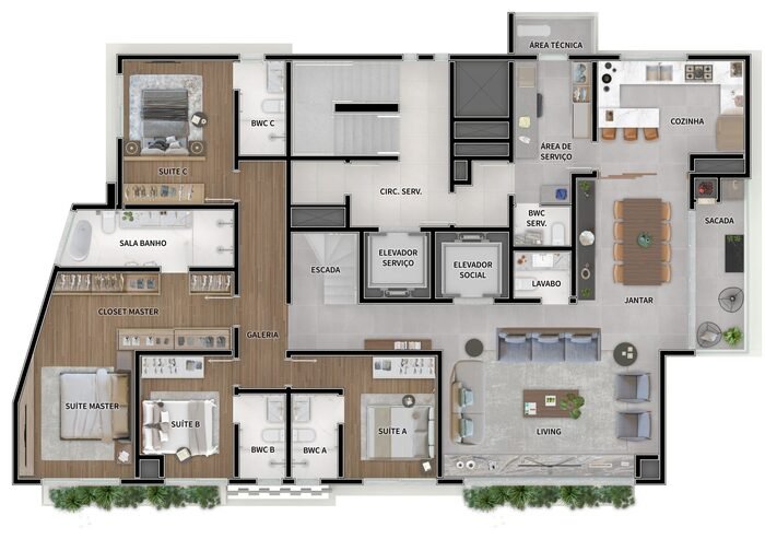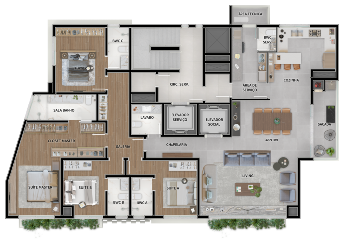 202,19 m² privativos, 4 suítes, com 3 vagas de garagem.
